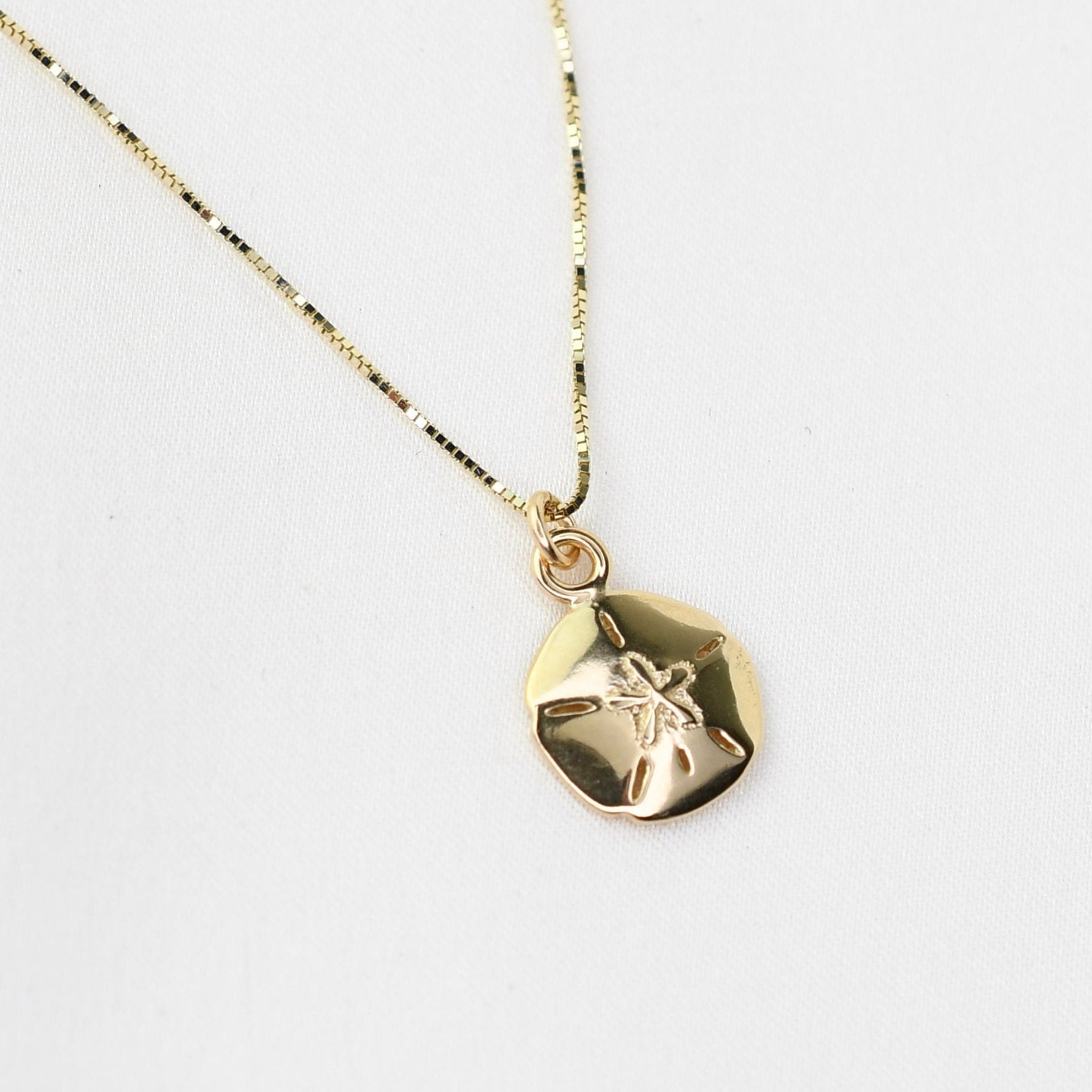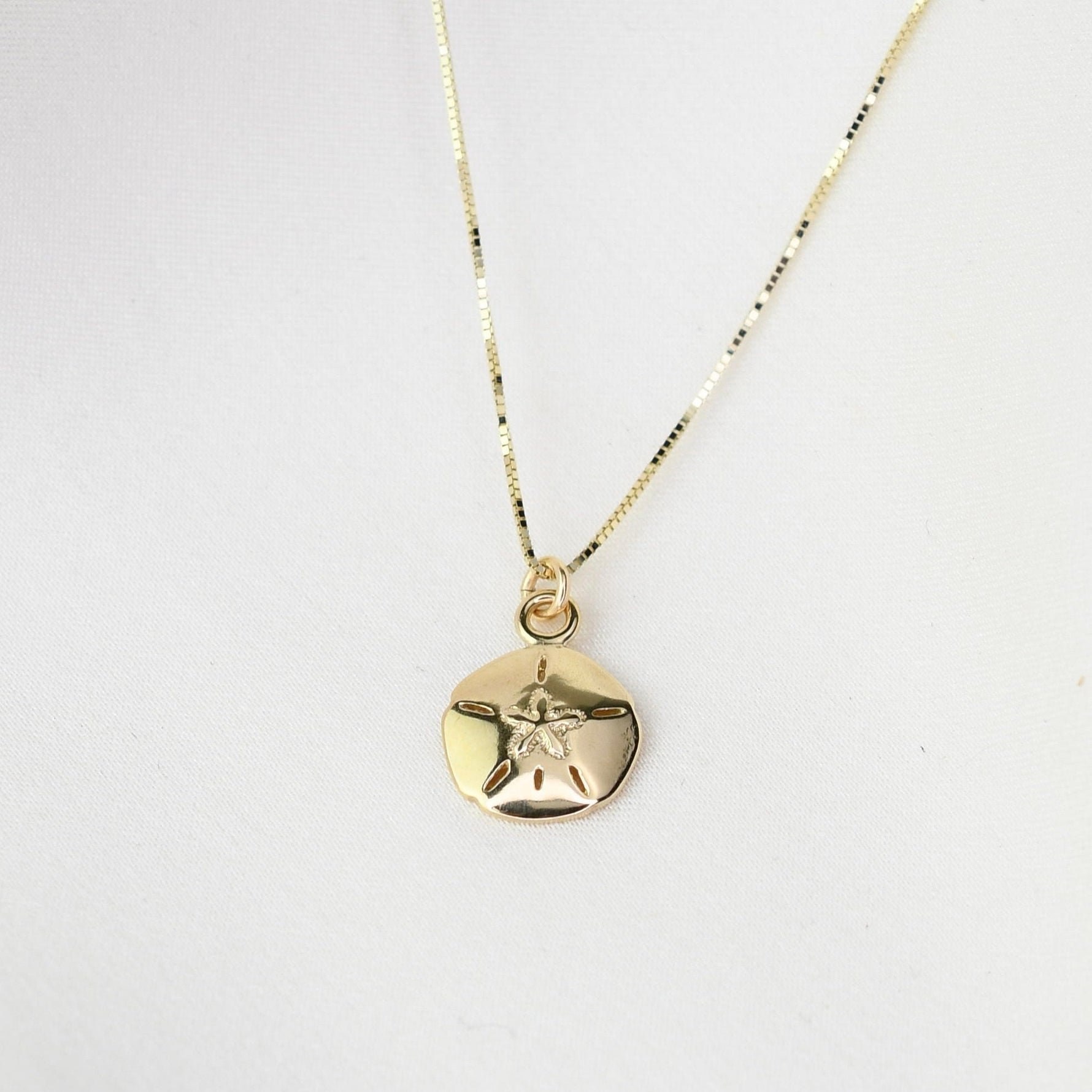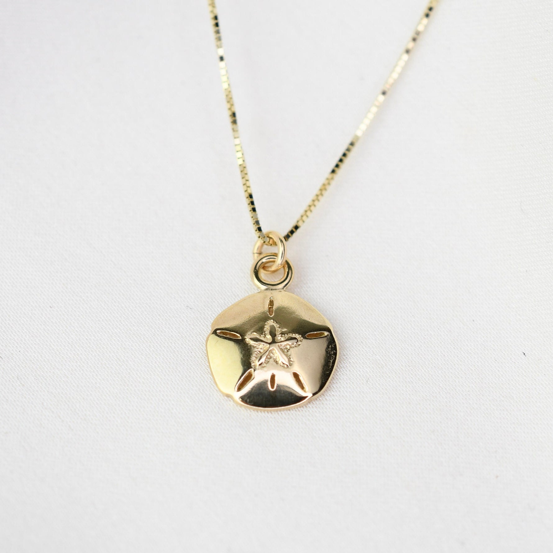 This delicate sand dollar necklace is crafted from 100% solid 14K gold, featuring a tiny, detailed sand dollar charm suspended from an ultra-fine 0.5mm 14K gold box chain. Lightweight and elegant, it’s perfect for everyday wear and layers beautifully with other necklaces.
